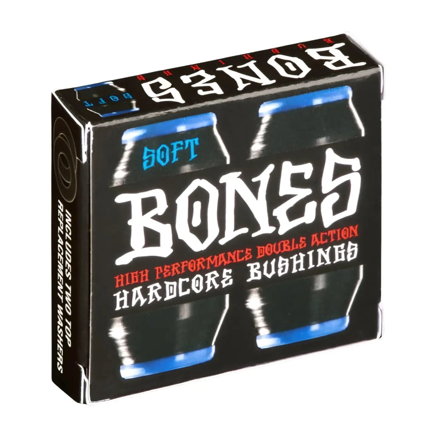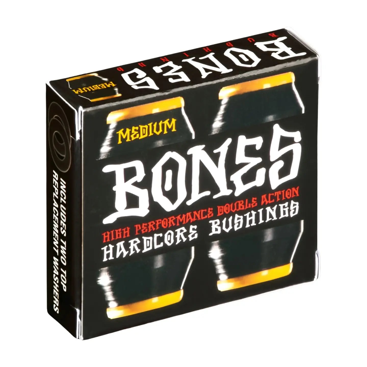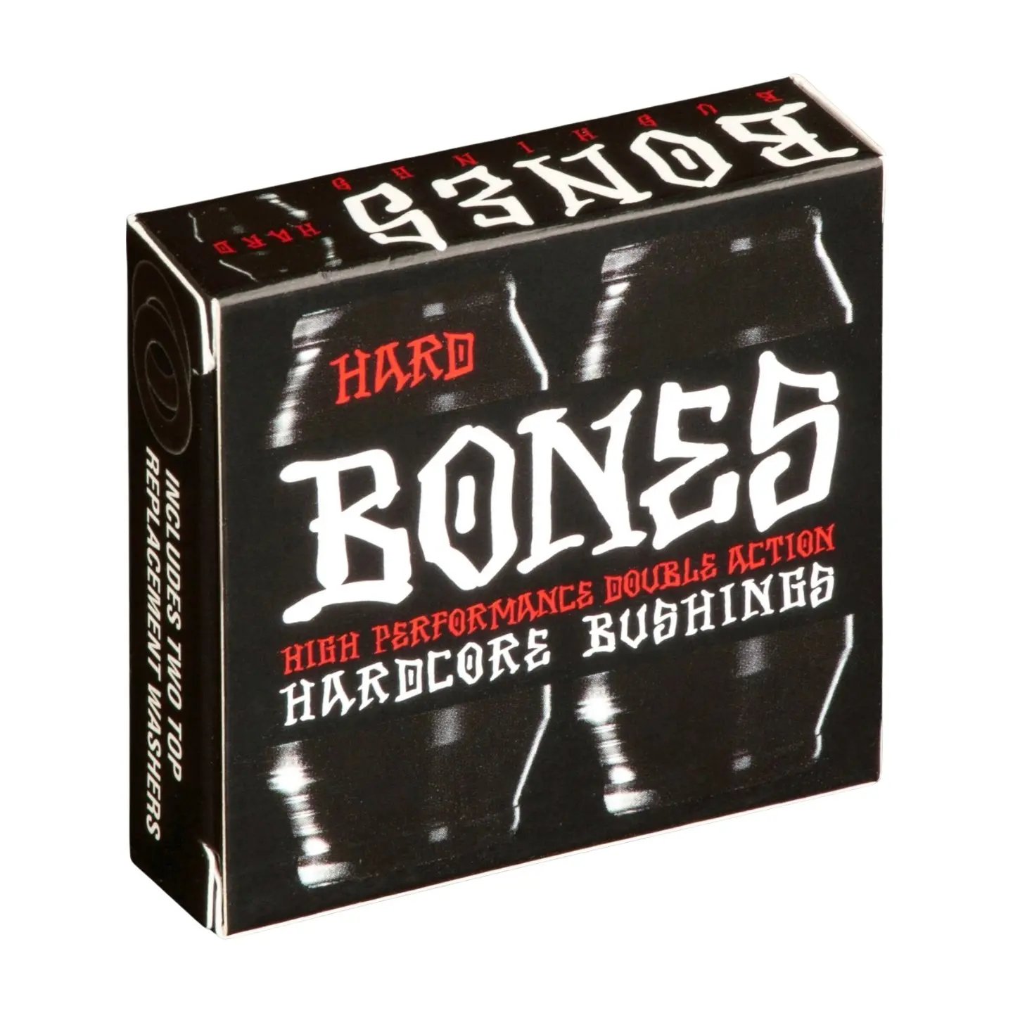 Het HardCore-inzetstuk in het midden van de BONES-bussen verbindt de twee zijden van elke bus met elkaar door ze aan het HardCore-inzetstuk te hechten. Wanneer het hangerweb één kant van een HardCore-bus samendrukt, reageert die kant van de bus net als een normale bus, maar de chemische binding tussen de HardCore en het kussen zorgt ervoor dat de bus er aan de andere kant niet uit wordt gedrukt. Het verhoogt eigenlijk de weerstand tegen draaien omdat het op zijn plaats wordt gehouden door de HardCore-insert. Dit betekent in feite dat BEIDE zijden van de BONES HardCore Bushing je draaikracht weerstaan.Daarom noemen we BONES Bushings de eerste double action truck bushings.