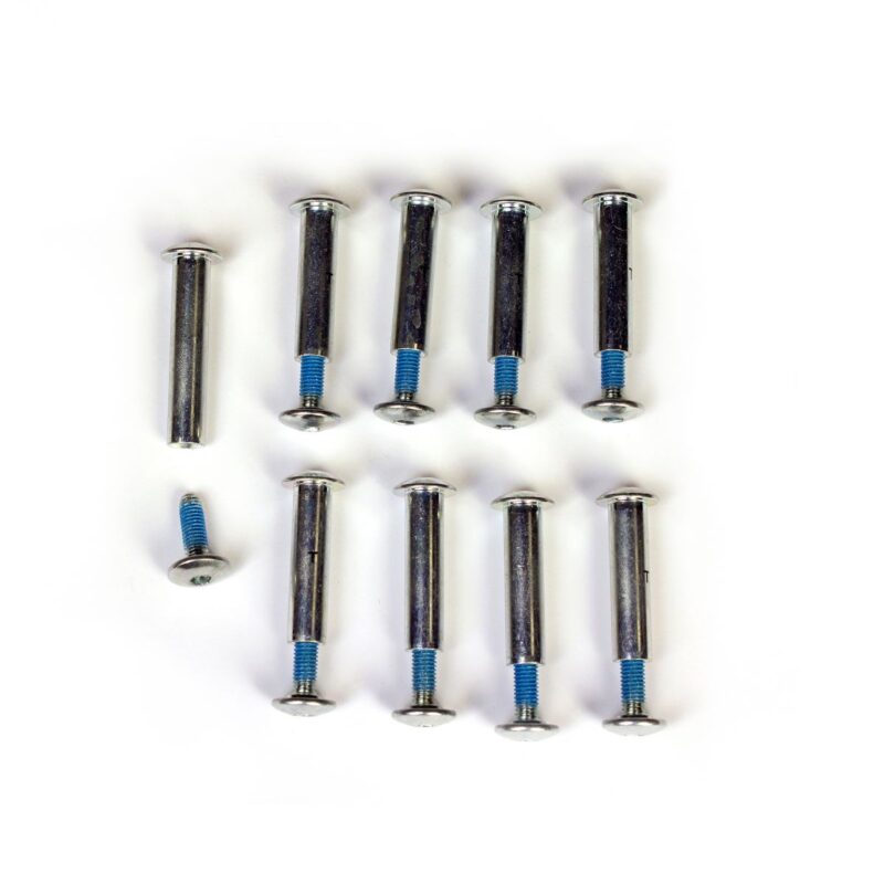A set of eight aluminum axles plus one longer brake axle for Rollerblade ZETRABLADE, MACROBLADE COMP & SIRIO COMP skates.