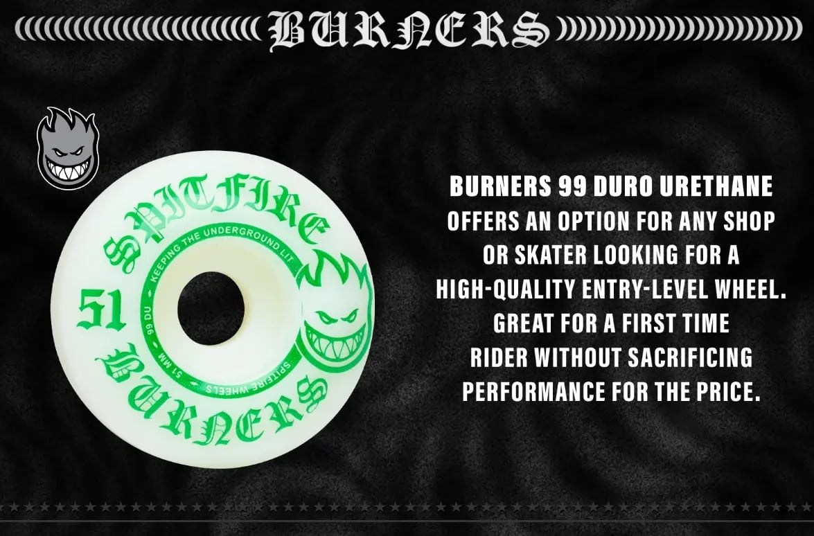 Spitfire is een iconisch skateboardmerk, bekend om zijn duurzaamheid en prestaties. De wielen van Spitfire bieden een soepele rit en uitstekende grip, waardoor ze geschikt zijn voor zowel beginners als gevorderde skaters. Met hun krachtige ontwerp en betrouwbare kwaliteit, blijven ze een favoriet onder skateboarders wereldwijd. Of je nu in de straat of op een halfpipe skate, Spitfire levert altijd topkwaliteit.